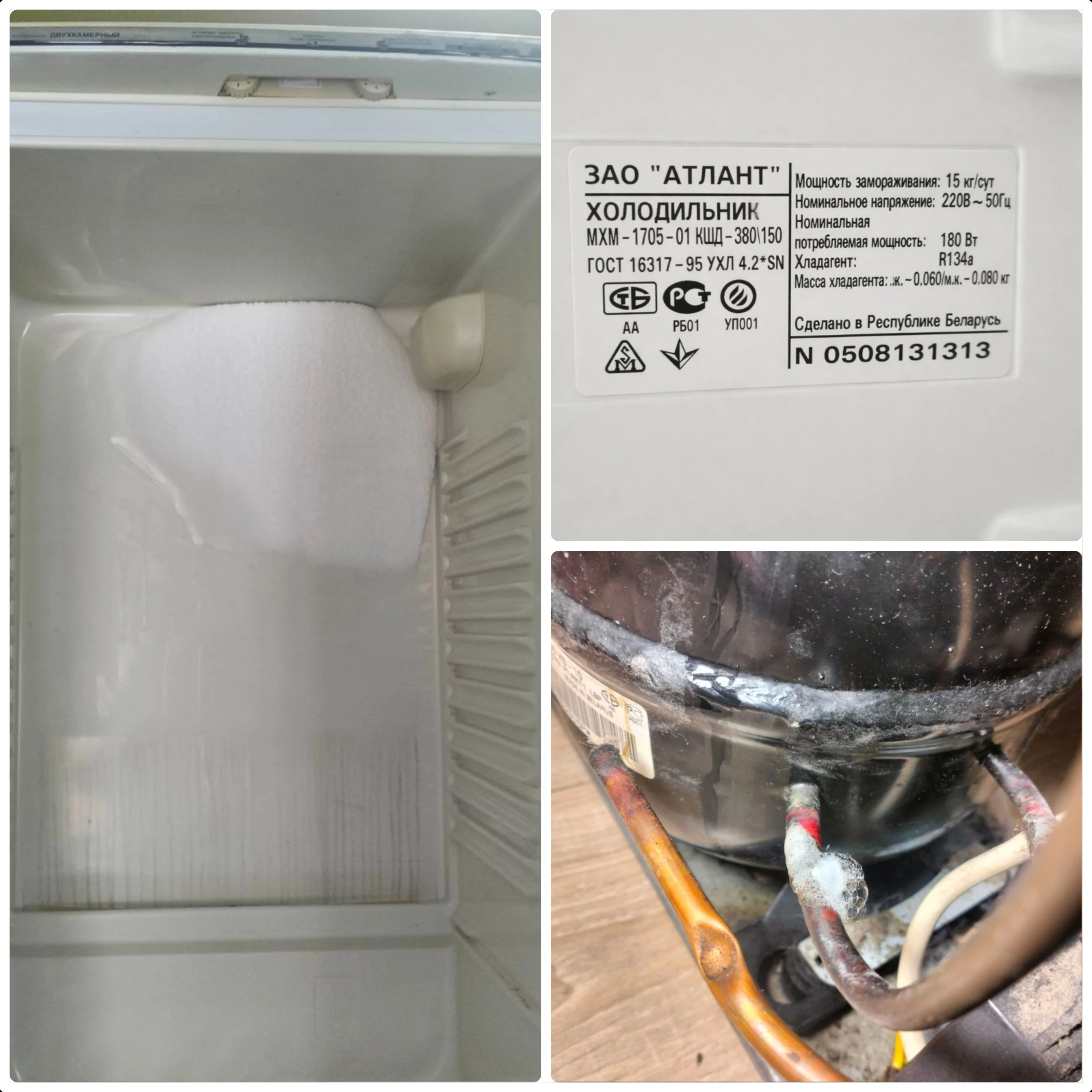 В ходе диагностики выявлена утечка фреона в месте пайки компрессора с контуром низкого давления. Из-за этого холодильник стал хуже охлаждать, что и привело к намерзанию льда на задней стенке.